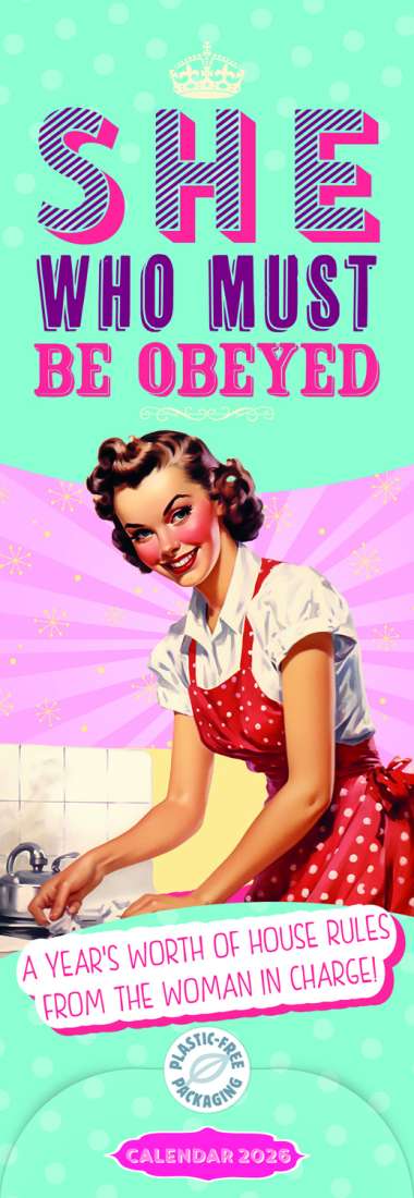 Stay organised with a touch of humour using the She Who Must Be Obeyed slim calendar for 2026! Packed with witty and playful house rules from the lady of the house, this calendar brings a smile to your daily routine. Each month is adorned with clever reminders alongside a practical date grid, giving you ample space for appointments and notes. Not only will it keep your household in order, but its also eco-friendly, free from plastic packaging. A fun and functional addition to any home!