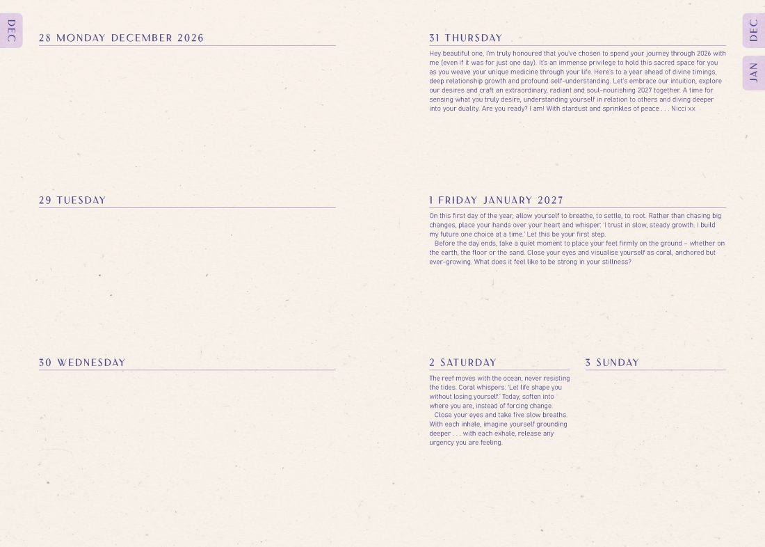 This full-colour, beautifully illustrated planner will teach you how to harness the energy and guidance of the moon, seasons, and sacred celebrations of 2027 so you can thrive throughout the year. As you’re guided through the year, learn how to use crystals, essential oils, affirmations, and rituals to harness your inner goddess. You’ll also discover how to live in harmony and alignment with the moon and Mother Nature, transforming your life into one of clarity, balance, and joy.