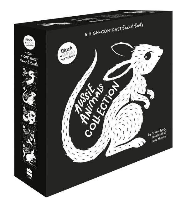 An adorable 5-book collection of the bestselling black and white for babies high-contrast board book series! Your baby loves black and white! New bubs see the world differently, and these high-contrast board books are perfect for engaging their developing eyesight, strengthening their cognitive abilities and encouraging their gross motor skills. Bond with your baby as you introduce them to the world of adorable Aussie Animals! Meet water babies, bird babies, baby animals, bouncing animals, and farm babies in this adorable 5-book collection. Includes: Aussie Baby Animals, Aussie Bird Babies, Aussie Farm Babies, Aussie Water Babies, and Bouncing Aussie Animals.