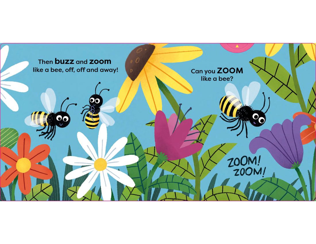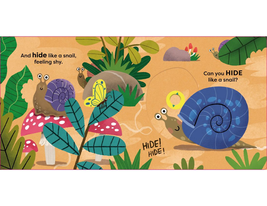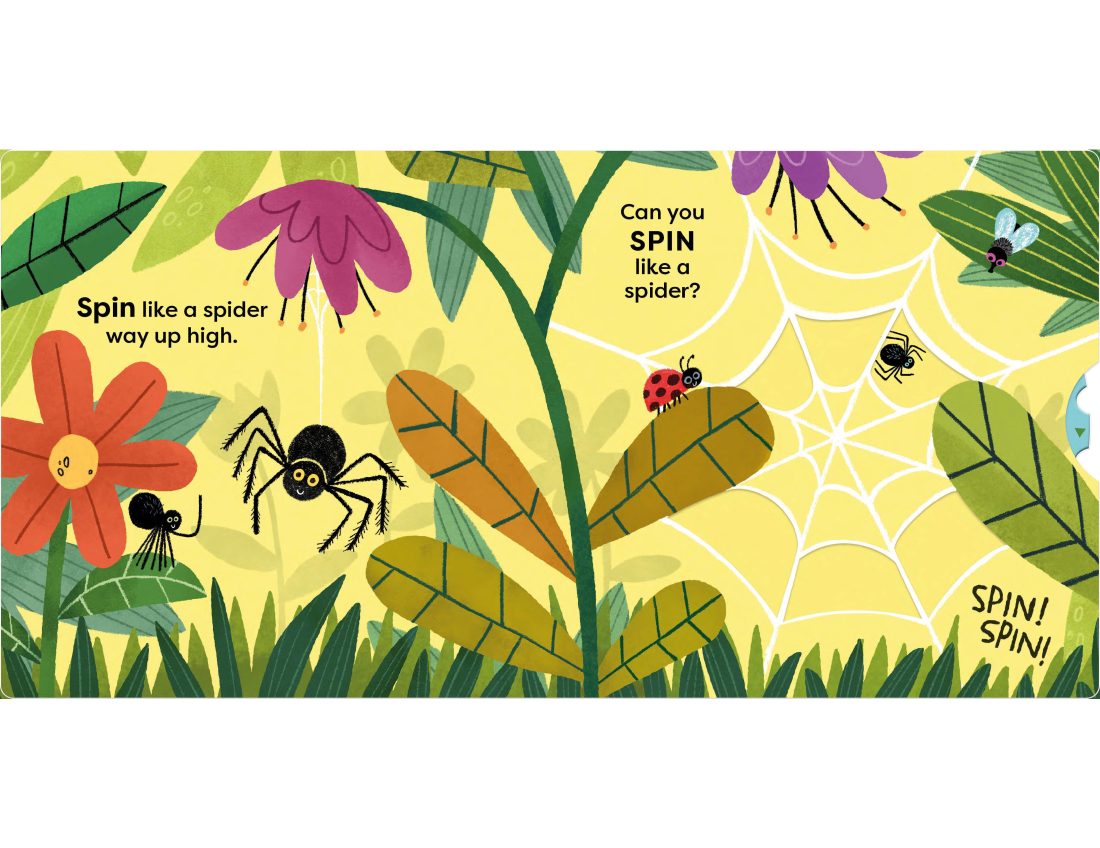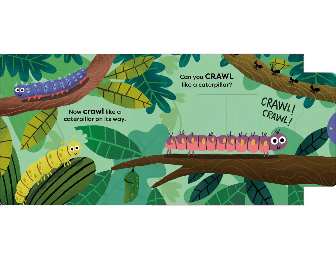 A buzzing new novelty book with lots of fun animals and sliders to push, pull and jiggle. With simple rhyming text, things to push pull and spin, and brilliant illustrations from Guilerhem Karsten, children will love to copy the movements of these animals and join in the jungle fun. A fun way to develop a child’s physical development and encourage them to explore the way their bodies move as they spin like a spider, hide like a snail, crawl like a caterpillar and buzz like a bee.