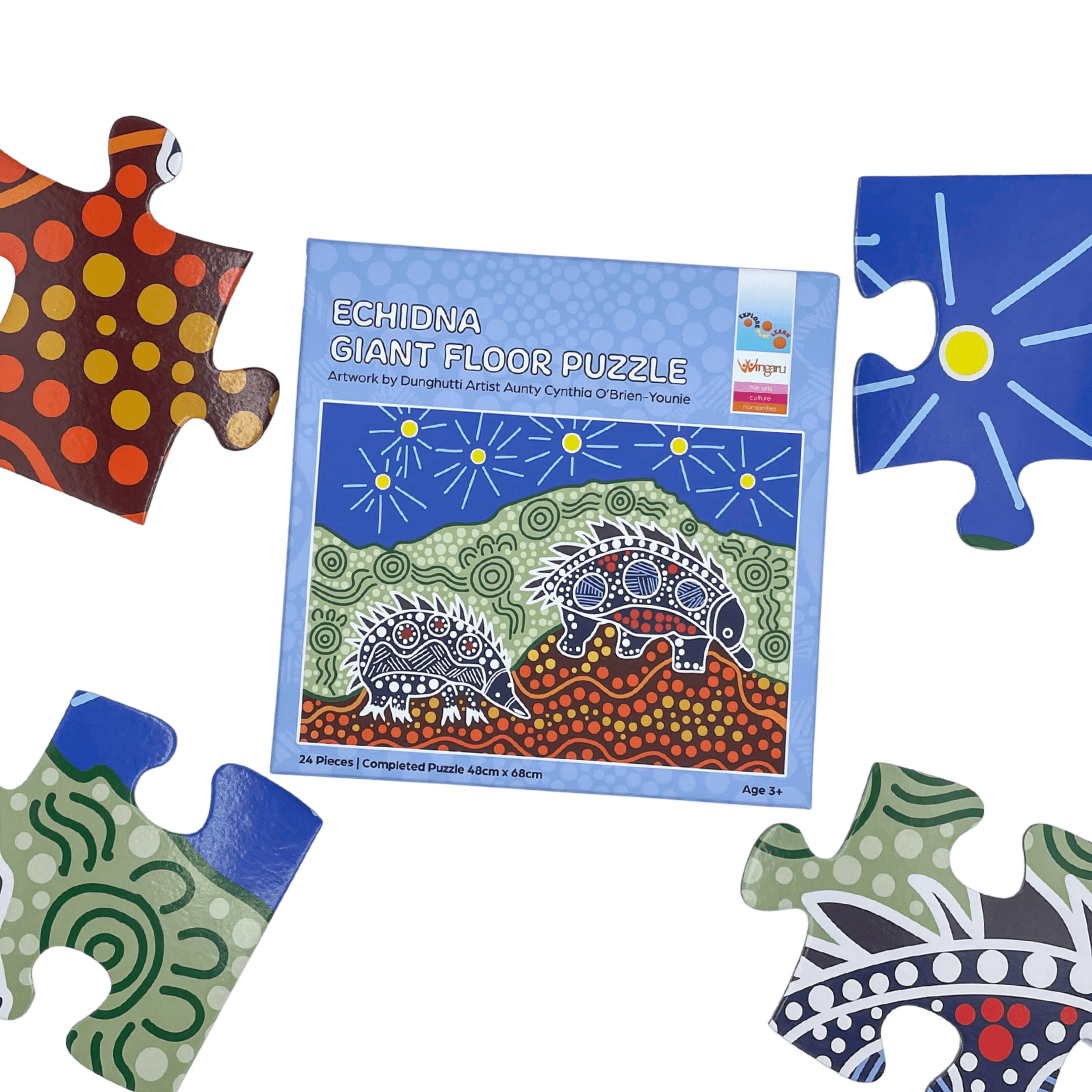 Celebrate Aussie animals and their surroundings with our 24-piece giant floor puzzle featuring stunning artwork by Dunghutti Artist Aunty Cynthia O’Brien-Younie. Perfect for everyday mindful moments, these puzzles encourage problem-solving, hand-eye coordination, and fine motor skills while inspiring curiosity about Australian wildlife and Aboriginal art.