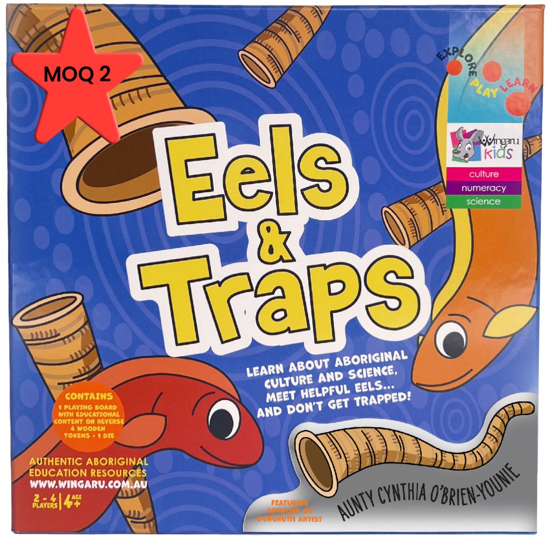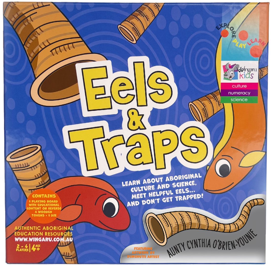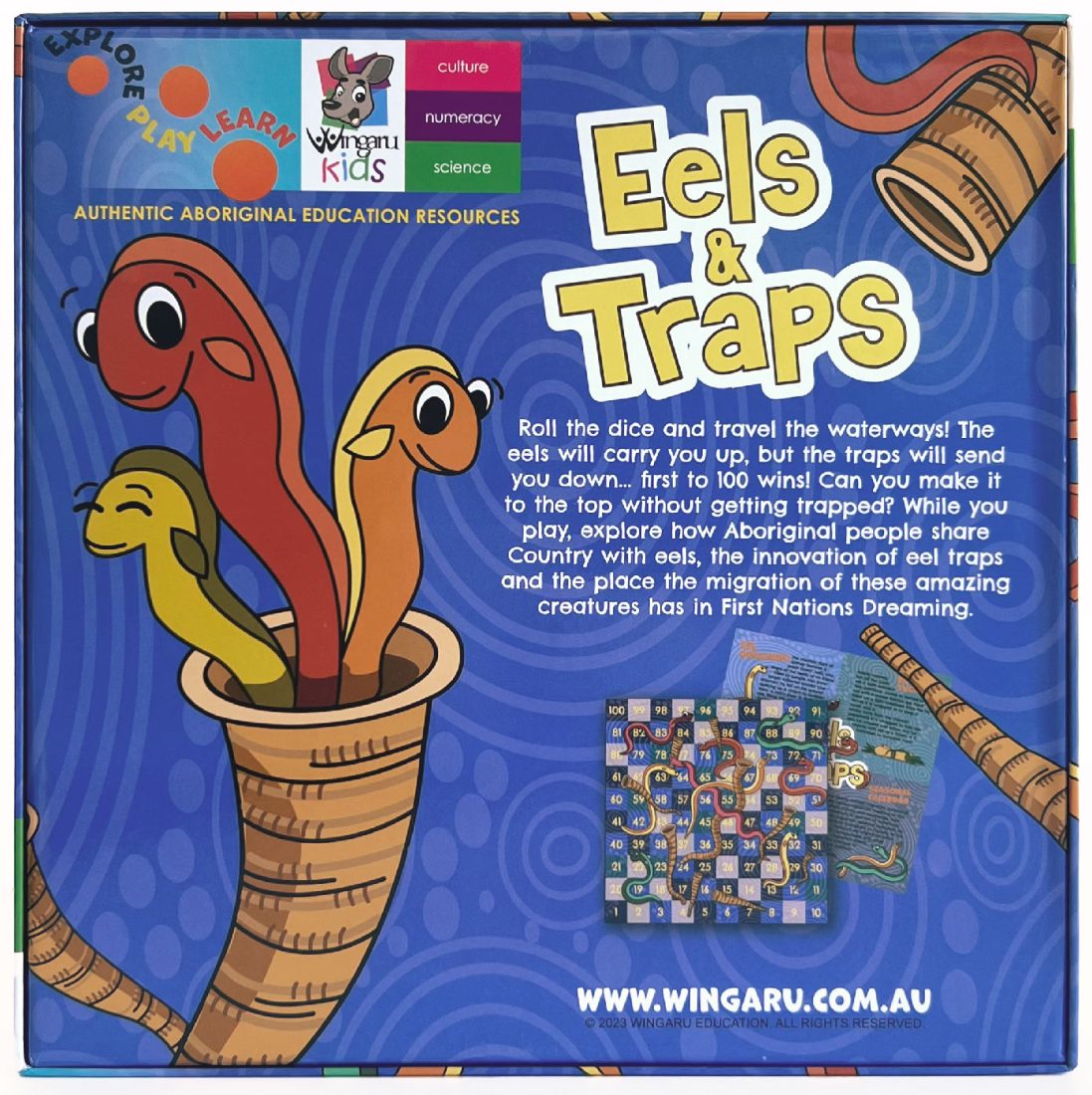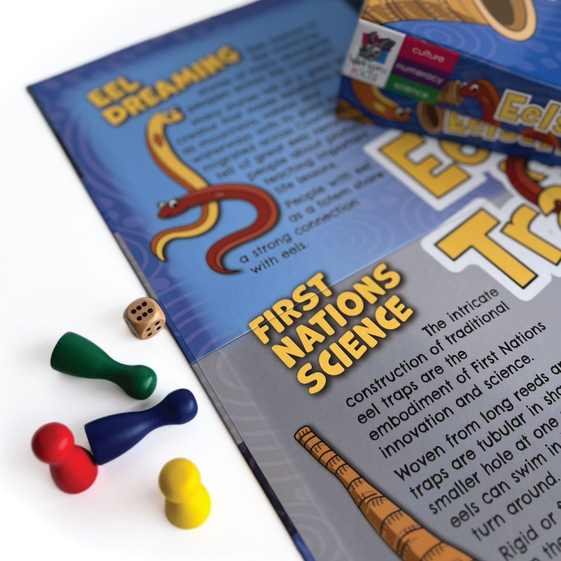 Roll the dice and travel the waterways! The eels will carry you up, but the traps will send you down…. first to 100 wins! Can you make it to the top without getting trapped? Explore how Aboriginal people share Country with eels, the innovation of eel traps and the place the migration of these amazing creatures has in First Nations Dreaming with this ‘snakes and ladders’ style game. Double sided board with game play on one side and educational content on the reverse. Featuring artwork by Dunghutti artist Aunty Cynthia O’Brien-Younie. Designed and produced by Wingaru Education, a 100% Aboriginal-owned education specialist. Minimum order requirement = 2.