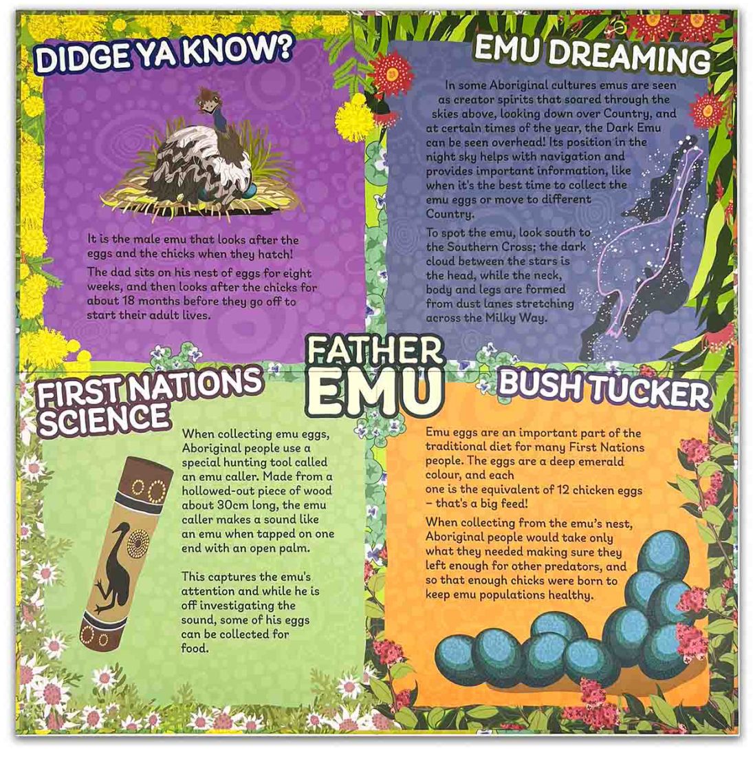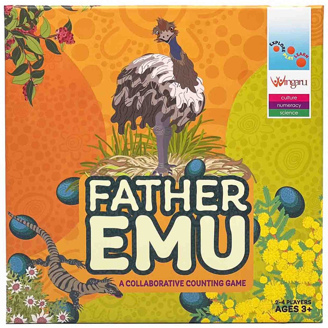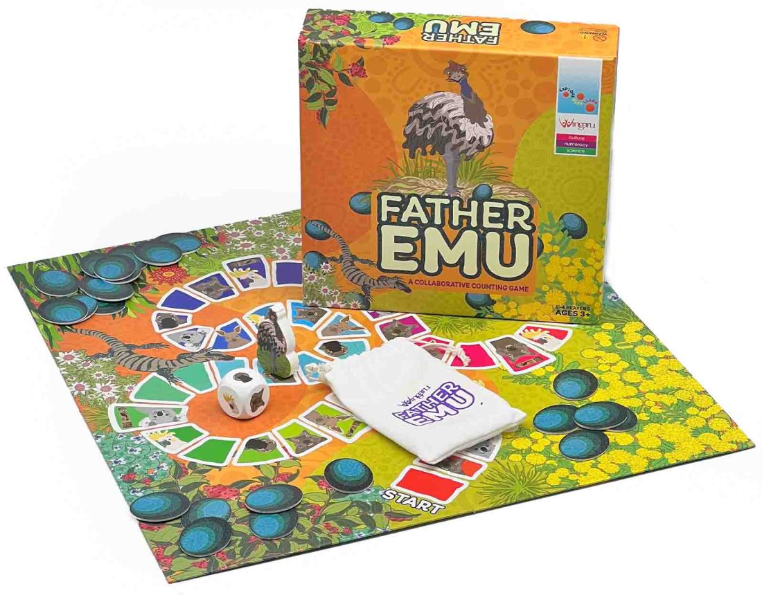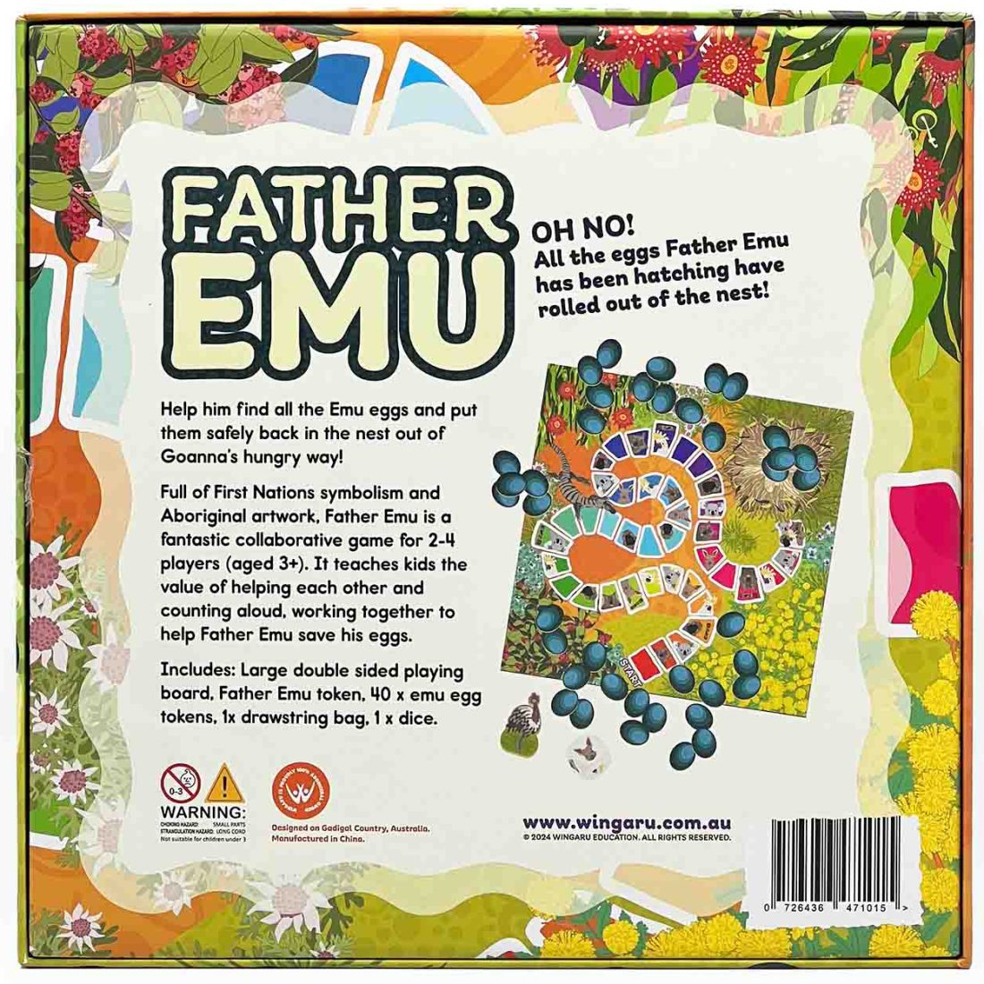 Oh no! All the eggs Father Emu has been hatching have rolled out of the nest! Help him find all the eggs and put them safely back in the nest out of Goanna’s hungry way! Full of First Nations symbolism and Aboriginal artwork, Father Emu is a fantastic collaborative game for 2-4 players. It teaches kids the value of helping each other and counting aloud, working together to help Father Emu save his eggs. Includes: Large 18inch Double sided playing Board featuring information about emus, their eggs and the relationship First Nations people have with them; Father Emu token; 40 x emu egg tokens; and 1 x dice. Box size: 25cm x 25cm x 4cm. Designed and produced by Wingaru Education, a 100% Aboriginal-owned education specialist. Minimum order requirement = 2.