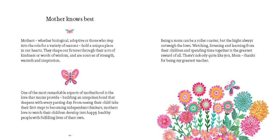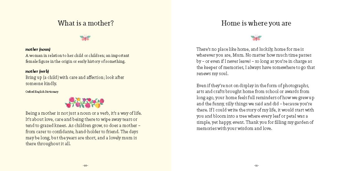 While the role of mum is a unique and individual experience, it is also universally understood that mums are the glue that holds families together. From remembering birthdays to booking holidays, pursuing a career to dispensing advice, there’s nothing that a mum can’t take in her stride, no matter what life throws at her. This book has poems, thoughts on motherhood and quotes that reflect the powerful influence of mothers. You’ll also find lists, musings on funny or wise things mums do and say, tips offering ways to show you how much I appreciate you as well as self-care and wellbeing suggestions to make sure you look after yourself.