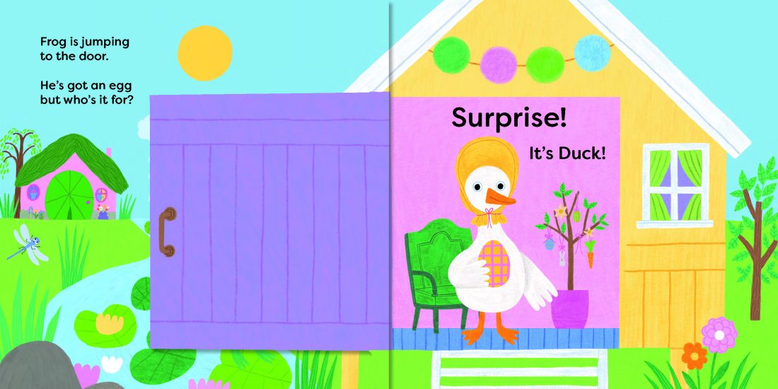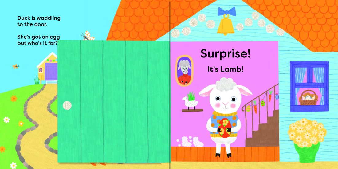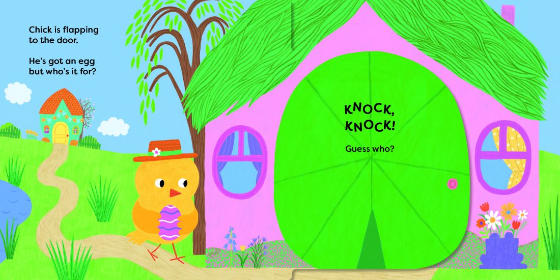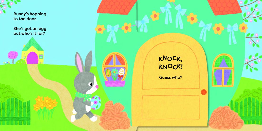 Knock, knock! Guess who? It’s Bunny and her happy friends delivering Easter Eggs. Open the door to see who’s at home. With six split-page doors to open and a mirror reveal on the final page, this interactive story encourages little ones to guess who’s behind each door. Happy Easter!