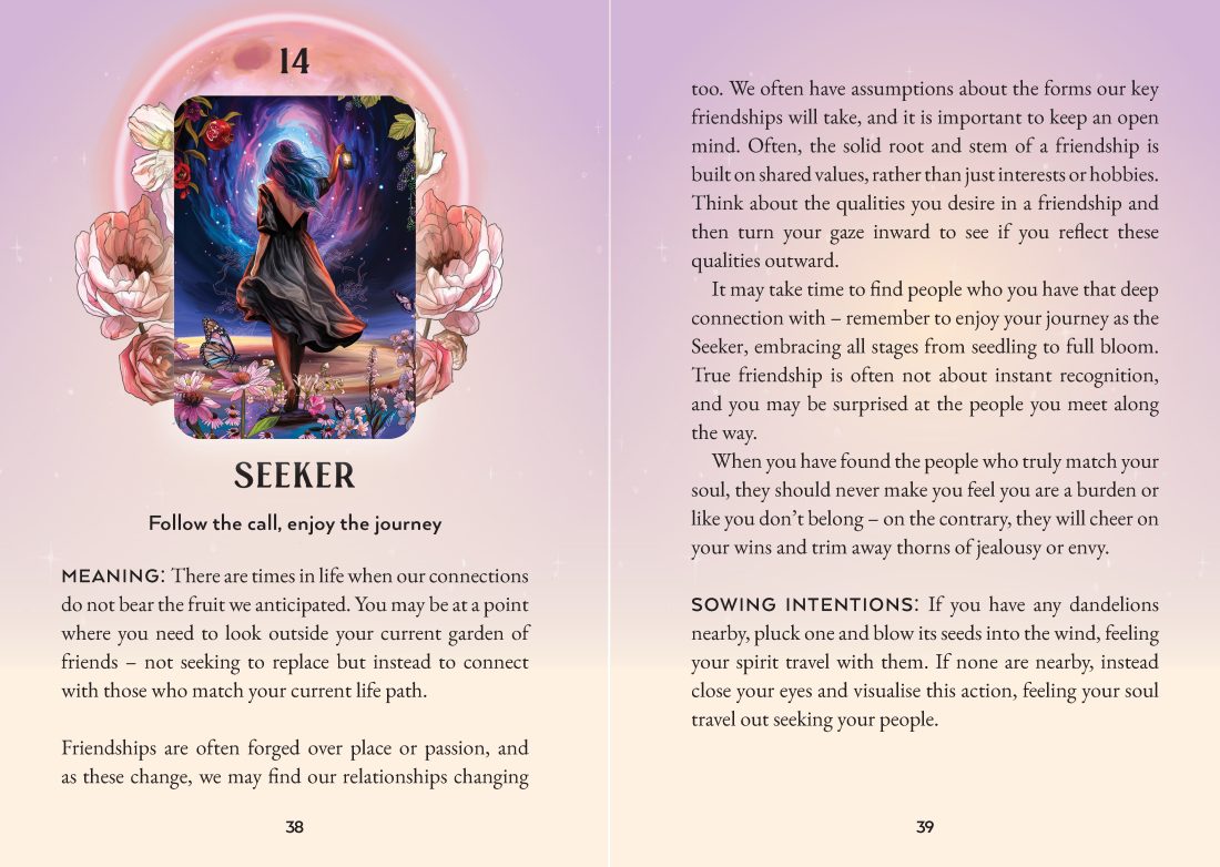 Revitalize existing bonds and connect anew with the help of nature’s nurturing guidance in this 36-card oracle deck. By harmonizing the reader with the natural world surrounding them, the Friendship Oracle works to strengthen old connections and plant the seeds of fresh friendships. Each card is infused with the ancient language of flowers, allowing the reader a sacred moment to bond with nature’s wisdom. For every season you experience in life, there is a lesson waiting in the rich soil of reflection. Water the gardens of connection and witness your friendships blossom.