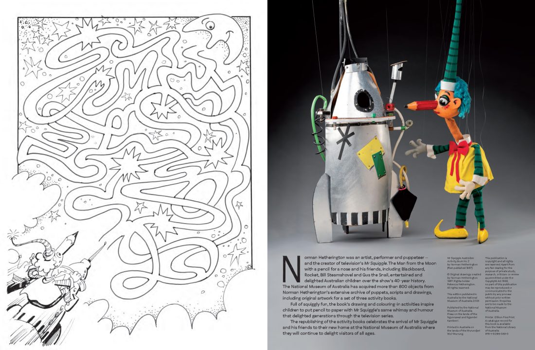 Mr Squiggle is back and ready to delight a new generation! To celebrate the arrival of Mr Squiggle and his friends – Rocket, Bill Steamshovel, Gus the Snail, and Blackboard – at the National Museum of Australia in Canberra, NMA Press has lovingly republished Norman Hetherington’s original Mr Squiggle Activity Books. These charming draw-along books, featuring characters from one of Australia’s longest-running children’s shows, harken back to a time when colouring-in and pen-to-paper fun were beloved pastimes.