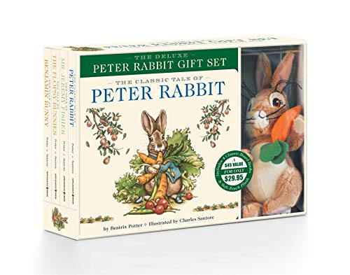 Beatrix Potter’s best-known children’s stories are now available as a deluxe four-book boxed set that includes a lovable, huggable Peter Rabbit plush! Hop into Beatrix Potter’s classic stories, colorfully rendered by Charles Santore, with this affordable deluxe board-book gift set. Featuring The Classic Tale of Peter Rabbit, Mr. Jeremy Fisher, Benjamin Bunny, and the Flopsy Bunnies, this set is a great gift for Easter baskets, baby showers, and everything in between. Enjoy the heartwarming adventures of Peter Rabbit and friends while snuggled up with a soft, lovable Peter Rabbit plushie and these four books that are perfect for kids of all ages.