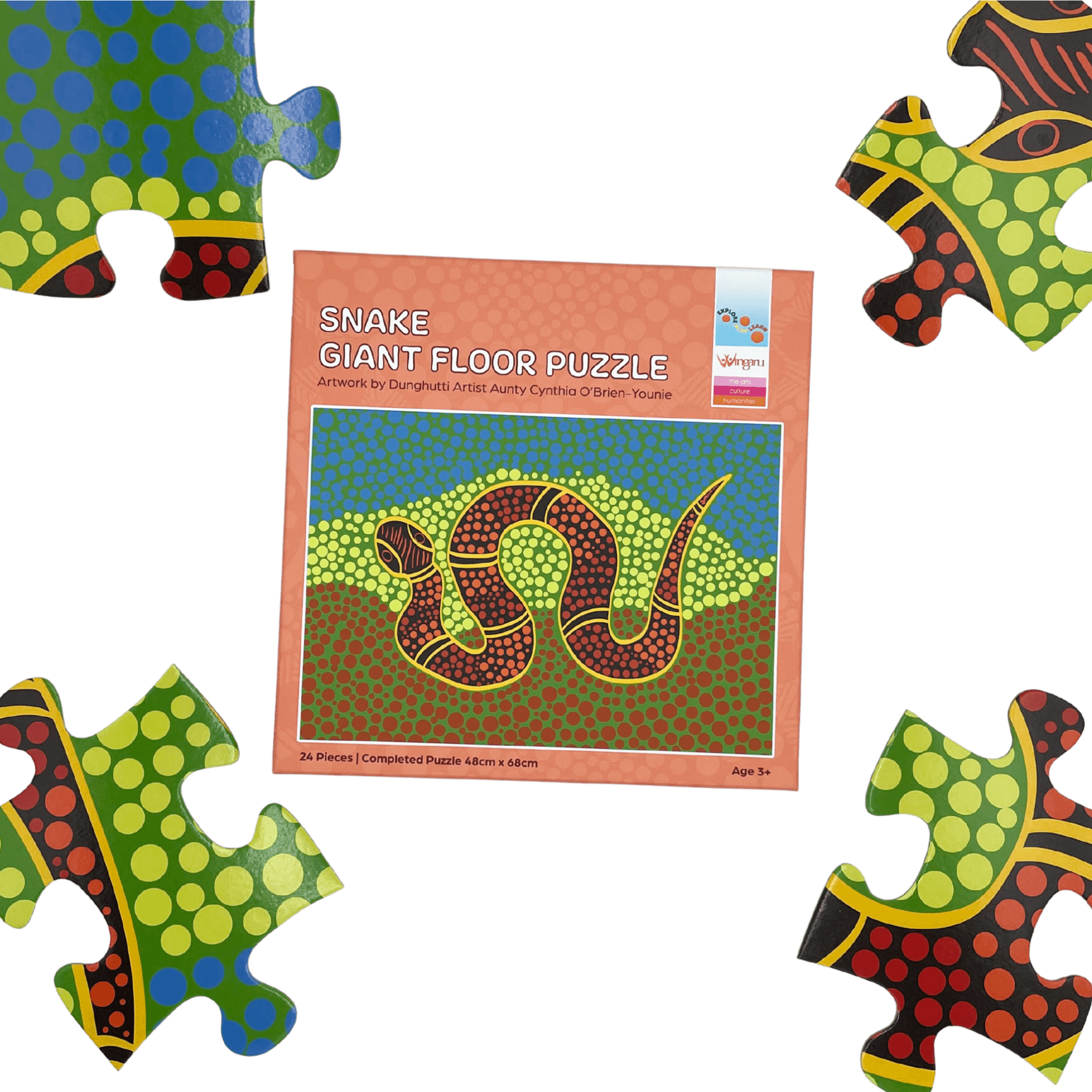 Celebrate Aussie animals and their surroundings with our 24-piece giant floor puzzle featuring stunning artwork by Dunghutti Artist Aunty Cynthia O’Brien-Younie. Perfect for everyday mindful moments, these puzzles encourage problem-solving, hand-eye coordination, and fine motor skills while inspiring curiosity about Australian wildlife and Aboriginal art.
