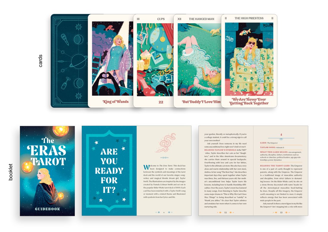 The Eras Tarot is a beautifully illustrated tarot deck and 192-page guidebook that blends the symbolism of the Rider-Waite tarot with the storytelling and lyrics of Taylor Swift. Drawing from her musical eras, easter eggs, and iconic imagery, each card is reimagined through a Swift-inspired lens. From “You Need to Calm Down” as Temperance to “Love Story” as The Lovers, this unofficial deck offers emotional insight and spiritual guidance for fans and tarot enthusiasts alike. A unique fusion of pop culture and mysticism.