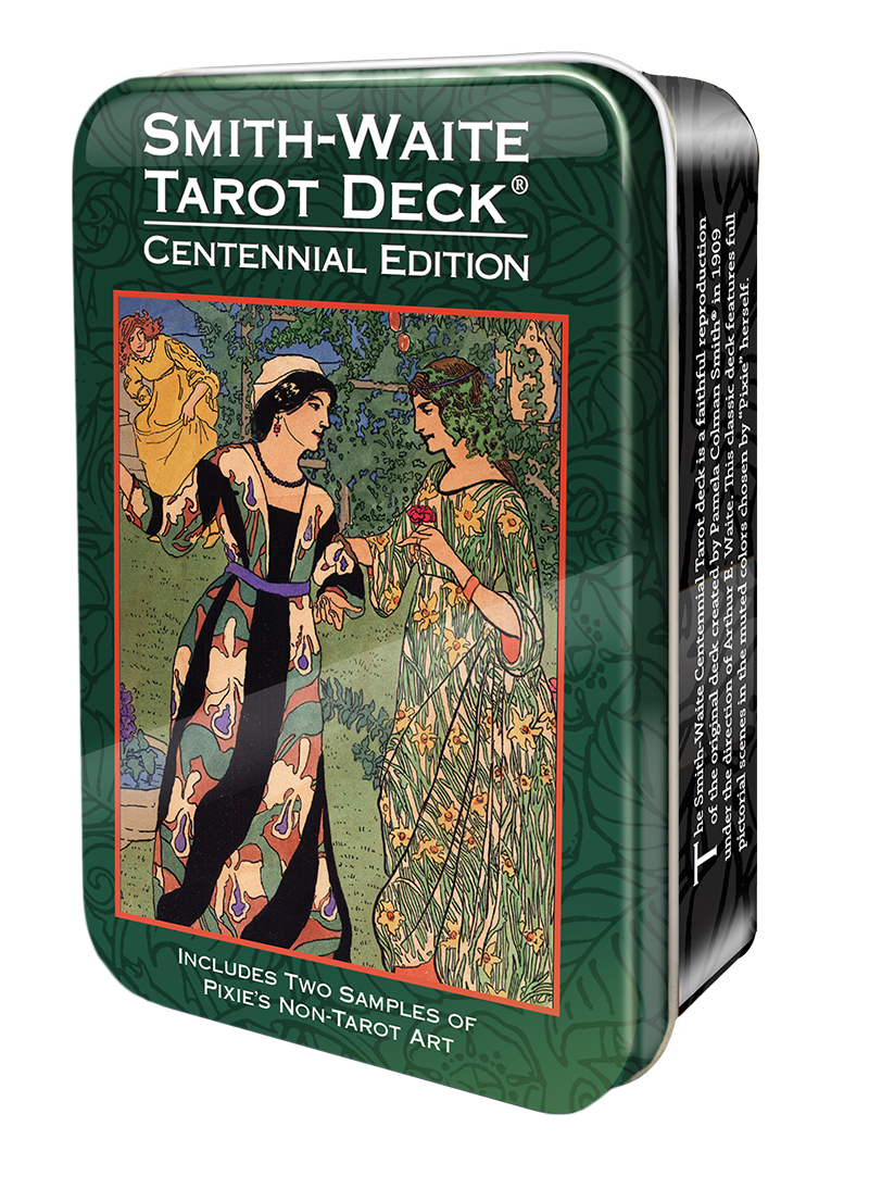 The Smith-Waite Centennial Tarot Deck in a Tin is a faithful reproduction of the original deck created by Pamela Colman Smith in 1909 under the direction of Arthur E. Waite. This classic tarot deck features full pictorial scenes in the muted colors chosen by Pixie herself. The deck was first issued in 2009 by U.S. Games Systems as part of the Pamela Colman Smith Commemorative Set. The 80-card deck includes the standard 78 tarot cards plus 2 samples of Pixie s non-tarot artwork. Cards in this pocket-sized deck measure 2.25in x 3.75in.