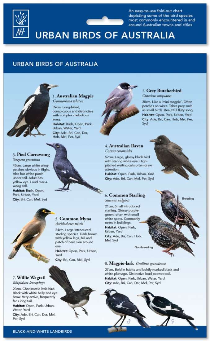 This easy-to-use fold-out chart depicts all the bird species most commonly seen in and around Australian towns and cities, from magpies and currawongs to kookaburras and cormorants. Each species has at least oneeye-catching photo, while for some there are up to three images showing different plumages for male, female, juvenile and so on. The sheet covers the 65 bird species most likely to be encountered in urban and suburban environments including in parks, backyards, builtup areas and wetlands and groups them together for easy comparison and identification.