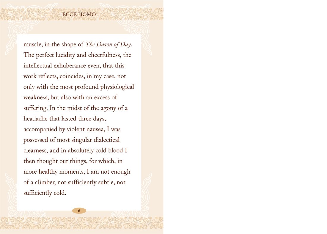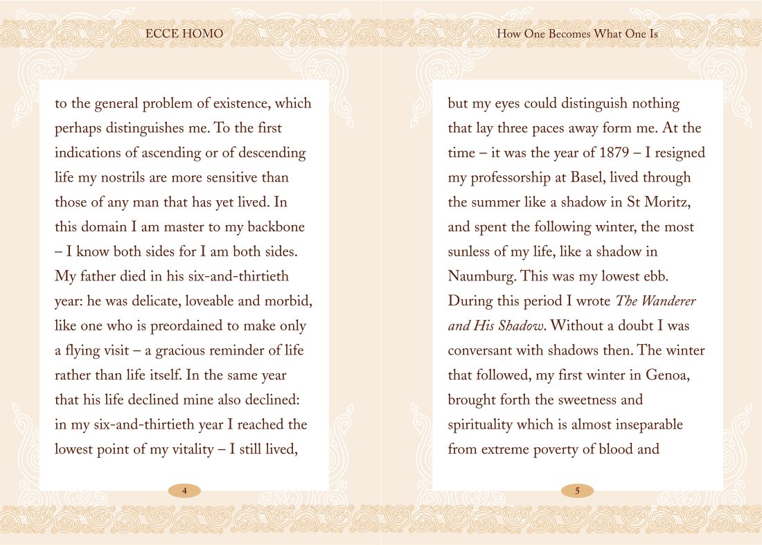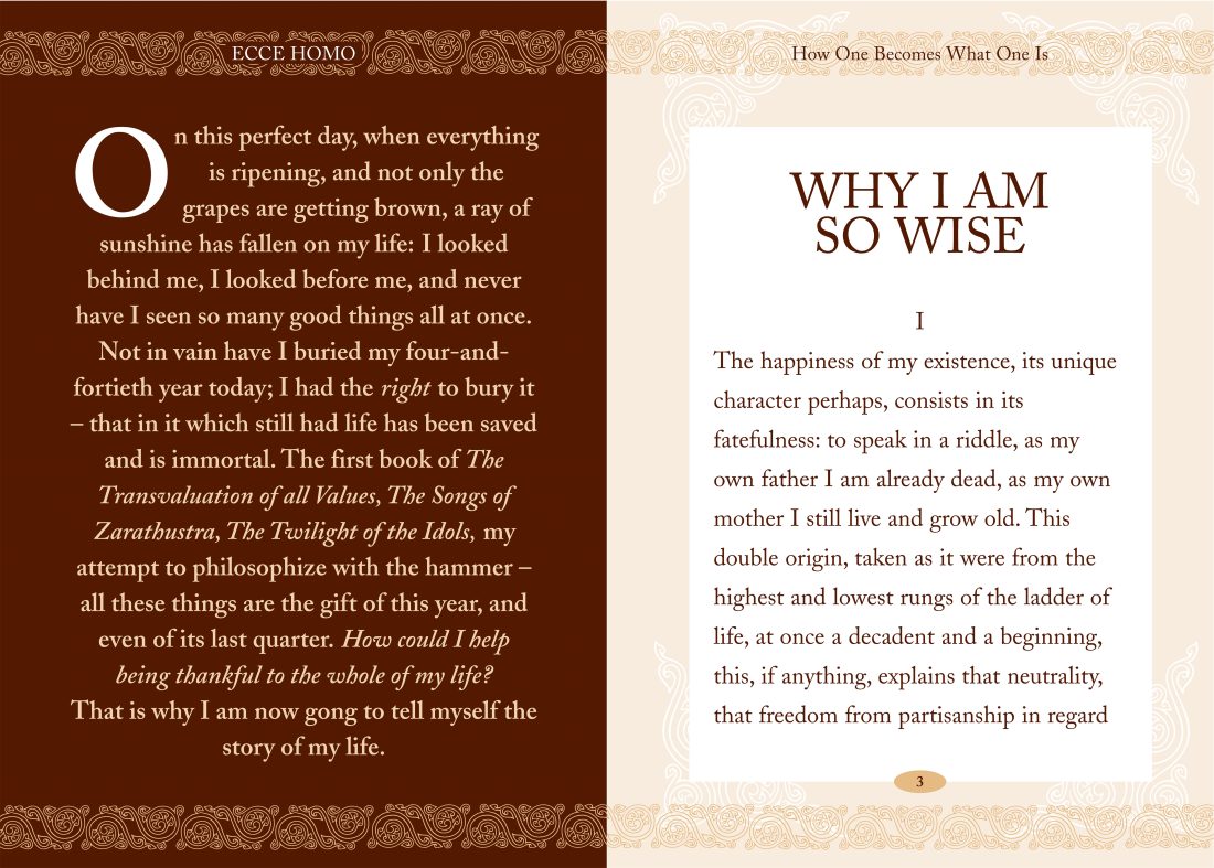 An elegant collector’s edition of Nietzsche’s classic autobiographical work, presented in a handsome pocket hardback edition with two-colour illustrations and a ribbon marker. Written in 1888 but not published until 1908, Why I Am So Wise is Nietzsche’s singular autobiography, which sets out the story of his life in bizarre and provocative fashion yet remains key to an understanding of his work. A timeless classic, which has inspired many writers and artists, including Thomas Mann, Hermann Hesse, Albert Camus, Salvador Dali and Jean-Paul Sartre.